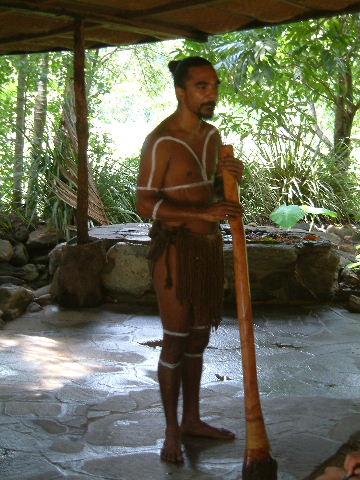 | Dieser gute Mann zeigt uns, wie man ein Didgeridoo spielt. |