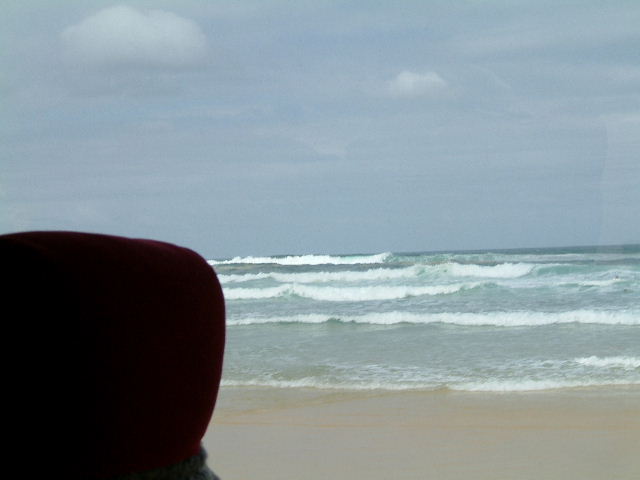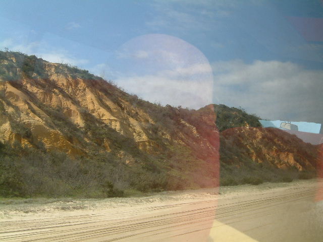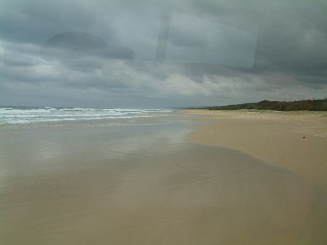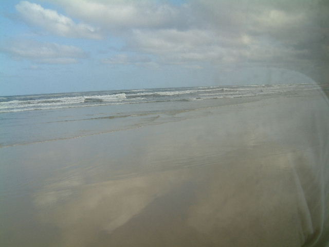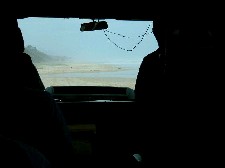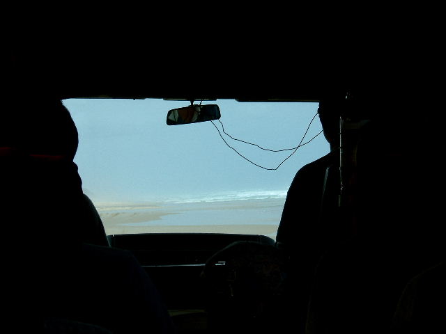 | Das ist der Blick durch die Fahrerkanzel. Wie man sieht fahren wir immer direkt am Wasser, weil dort der Sand natürlich viel glatter und auch fester ist. | |