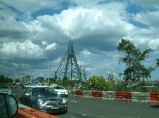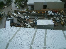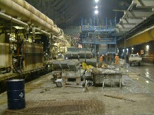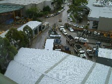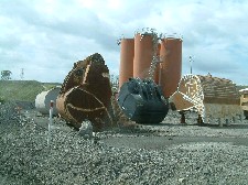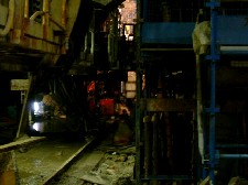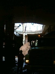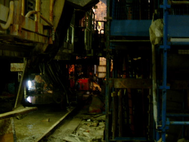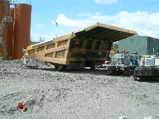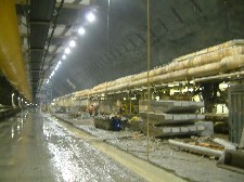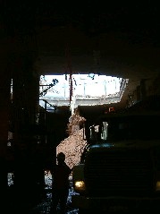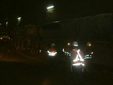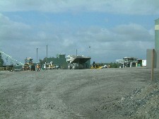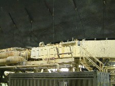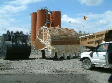 | Die Laster fahren in die temporäre Halle werden dort beladen, damit die